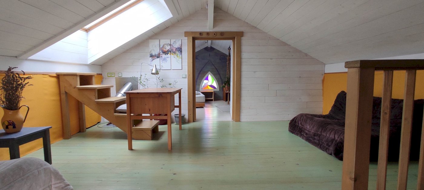 R+1 Appartement actuellement en colocation, mais libre dans les mois à venir. 78 m2 Carrez avec une belle grande pièce de vie, jolie hauteur de plafond 3,5m, 2 chambres avec mezzanines, SDB, toilettes et un R+2 sous combles avec encore deux pièces supplémentaires pour chambre + salon, bureau, pièce de jeux ou...