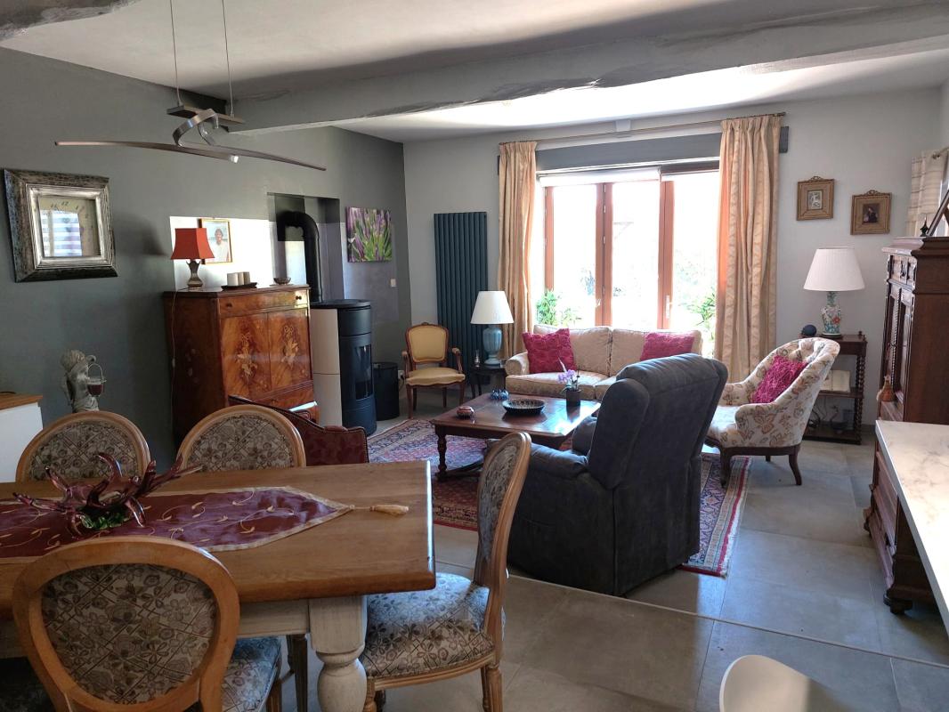 La seconde partie (la partie gîte) a sa propre entrée, dont le hall dessert un wc et le séjour avec cuisine ouverte (40m2), cette pièce est équipée d'un poêle à pellets,