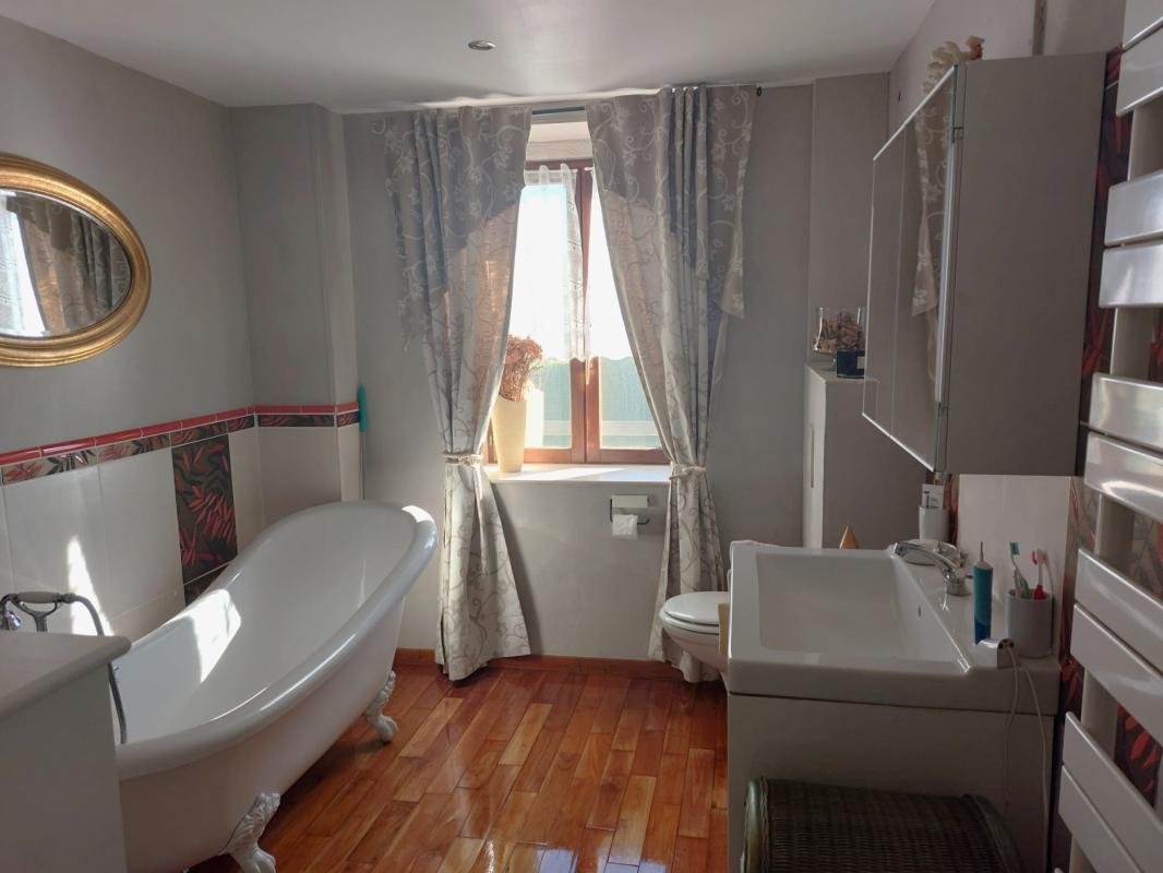 A l'étage, un pallier de 9m2 nous sert de bureau, il donne accès à une chambre de 10m2, ainsi qu'à une grande chambre de 17m2 avec salle de bains (7m2) munie d'une douche et d'une baignoire.