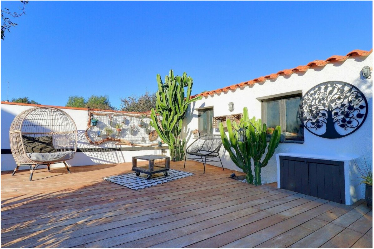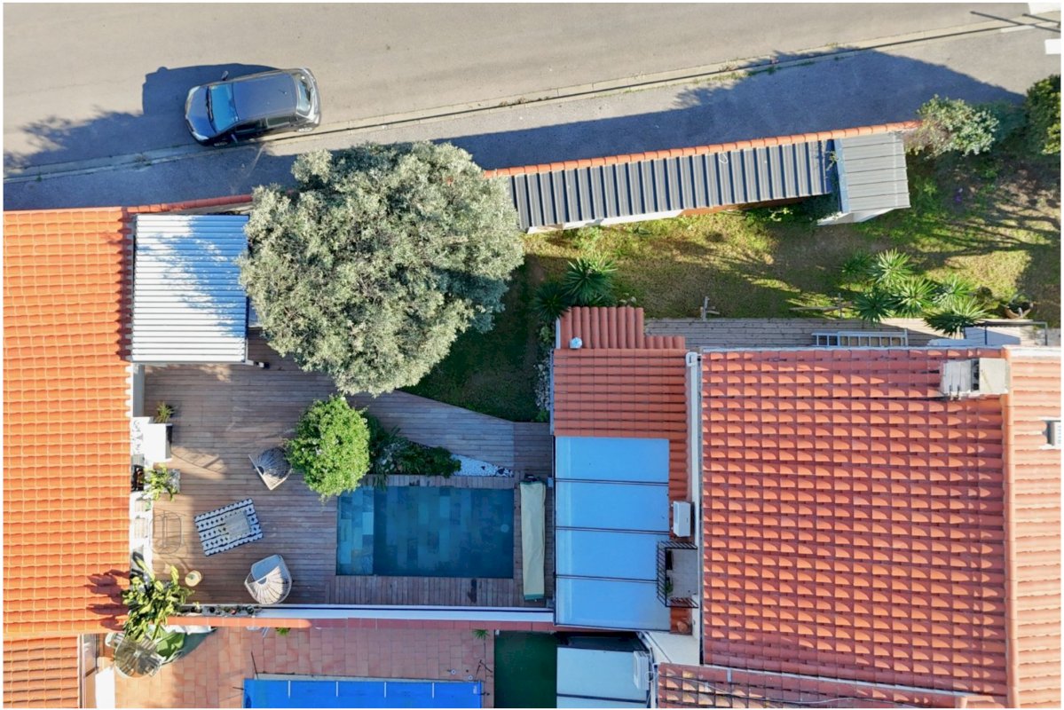 Perpignan Nord, villa de 125 m2 habitables sur une parcelle 3 faces de 450 m2 avec piscine maçonnée et carrelée. Terrasse bois exotique de 60m2 avec pergola bioclimatique