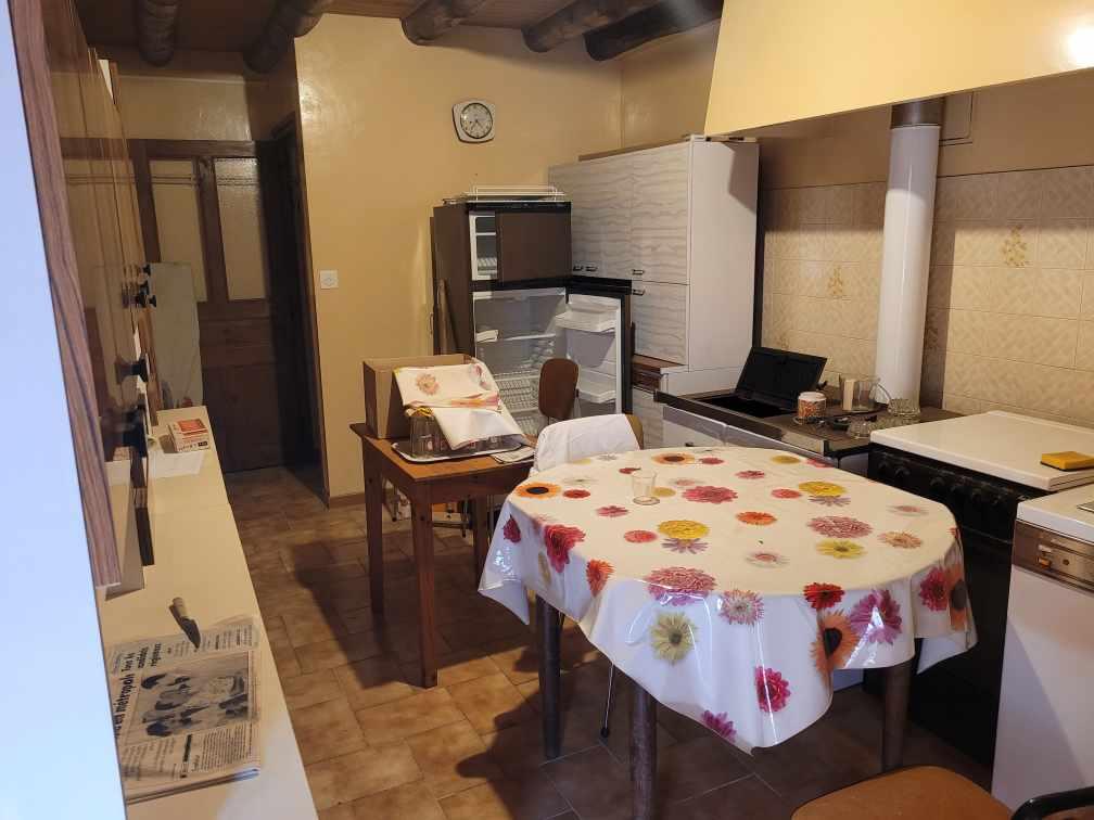 Salle à manger avec grande cheminée en pierre ( cantou), cuisine séparée avec cuisinière à bois alimentant 2 radiateurs dun rez de chaussée.