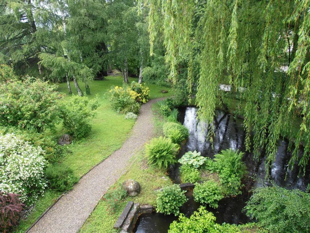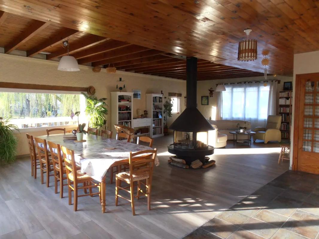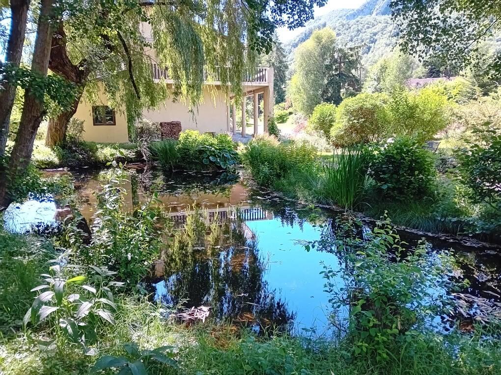 Extérieur : grand espace parking, parc arboré avec bassin et jardin. La rivière borde le parc et la maison par le Nord avec une chaussée, tempérant la chaleur estivale et réchauffant l'air en hiver.