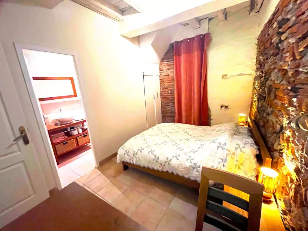 Chambre - 11.48 m² - Carrelage, mur briques et galets, puits de jour, placard,unité de climatisation réversible.