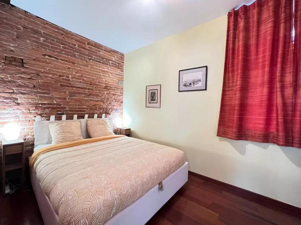Chambre - 10.12 m² - Mur en brique, poutre apparente, placard aménagé, sol parquet bois en bon état, unité de climatisation reversible.