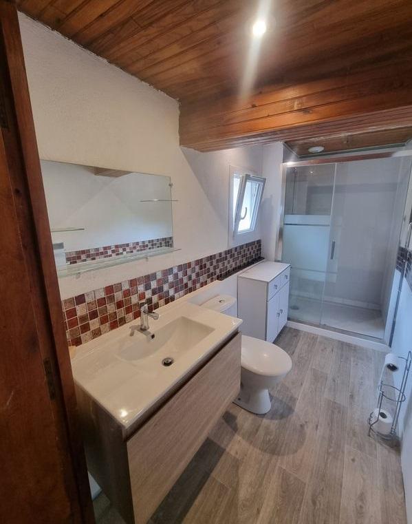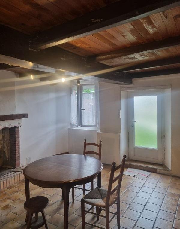 • Rez-de-chaussée : deux pièces : salle de séjour avec cheminée, cuisine aménagée.