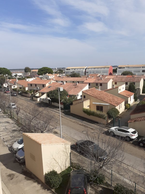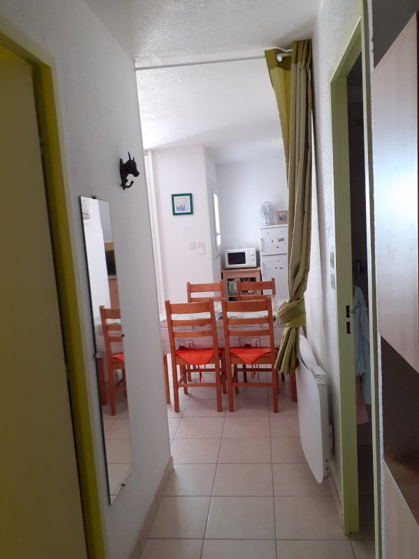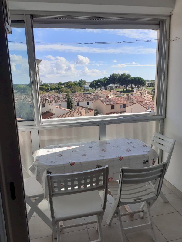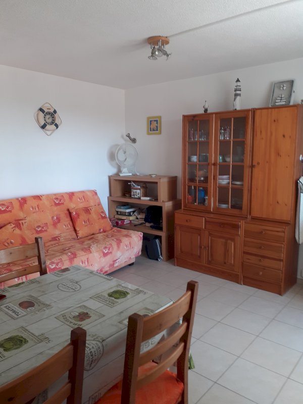 T2 cabine traversant E/O, au 3e étage, proche des commerces et de la mer, comprenant une chambre avec lit de 160 cm et un placard, un coin cabine avec 2 lits superposés de 90 cm disposant chacun d'un petit meuble, une salle d'eau avec WC, une cuisine équipée ouverte sur le séjour donnant sur la loggia avec vue dégagée.