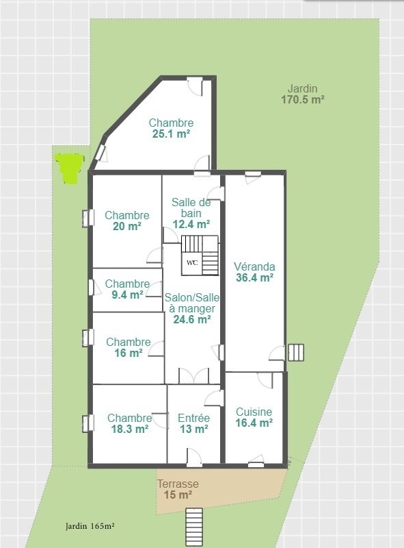 Jardin de 165m² avec le 1er étage de 150m² composé d'une entrée , cuisine, séjour , 4 chambres, SdB , Wc, véranda + 1 chambre indépendante . 2eme jardin de 270m² accessible en voiture (parking). Surface totale de la parcelle : 600m² .