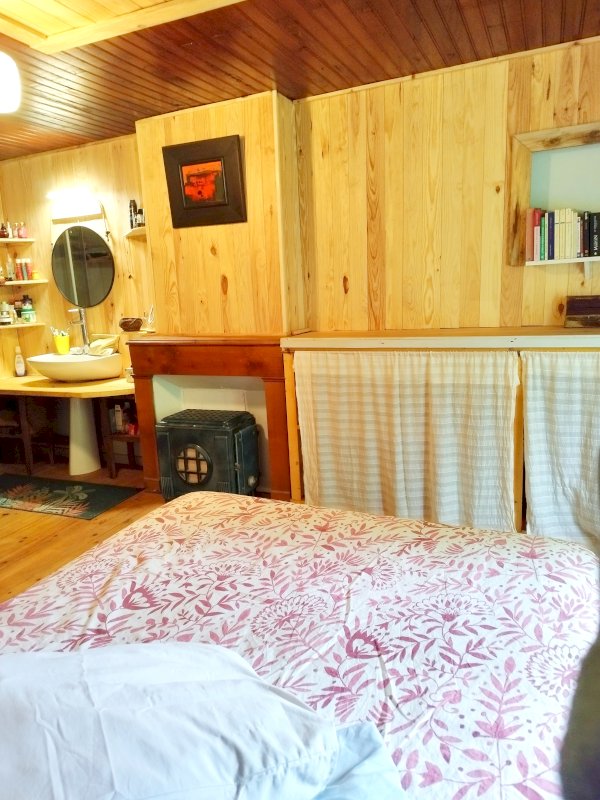 Salon, coin repas, cuisine, poêle à bois et gazinière bois en fonte émaillée 35m2.