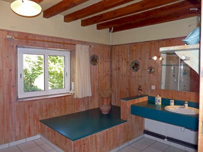 Grande douche-salle de bain : 9m2 en pin bordé, grand socle de vanité, grandes portes vitrées de douche d'angle. Baignoire non équipée ! Mais plomberie in Situ, sol carrelé et poutres en bois.