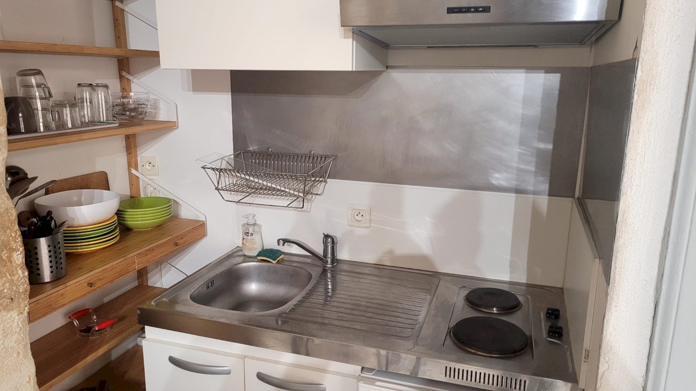 Au rez-de-chaussée d’un immeuble ancien de deux étages, ce F1 Bis de 29m2 a été entièrement rénové en 2017 avec pierres et poutres apparentes.