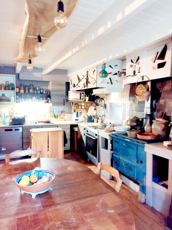 Salon, coin repas, cuisine, poêle à bois et gazinière bois en fonte émaillée 35m2.