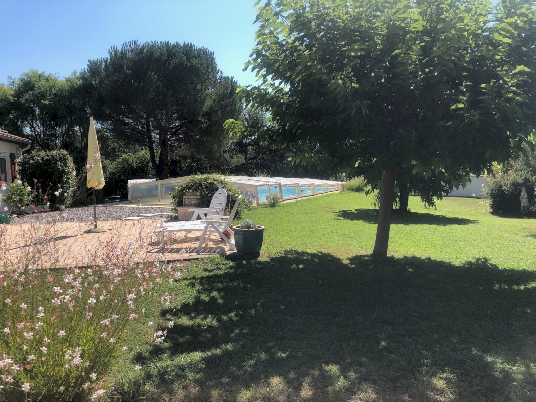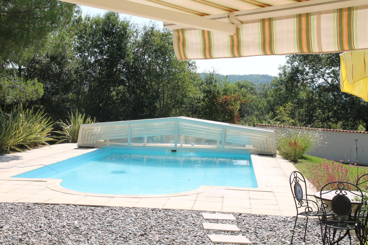 une grande piscine couverte avec abri sur rail permettant son usage d'avril à octobre inclus, gestion économique de l'eau avec récupérateurs,