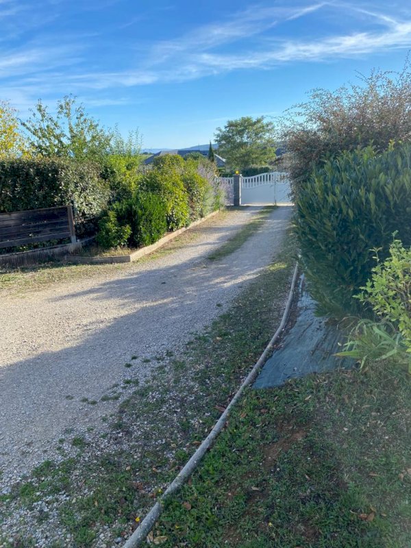 Un portail électrique se trouve à l'entrée de la parcelle, une longue allée permet d'accéder à la maison ainsi qu'aux garages.