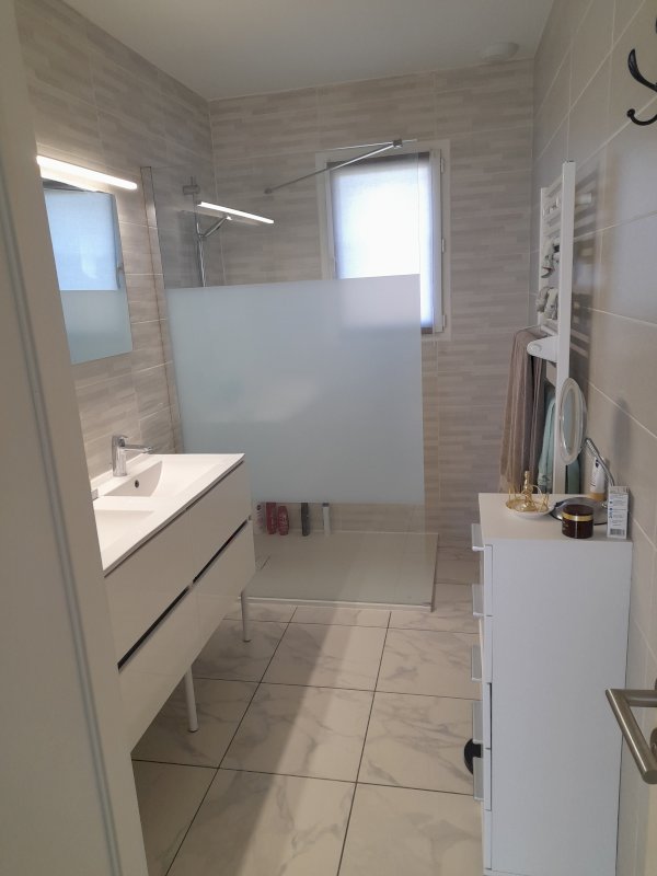 1 salle de bain avec double vasques et douche a l italienne