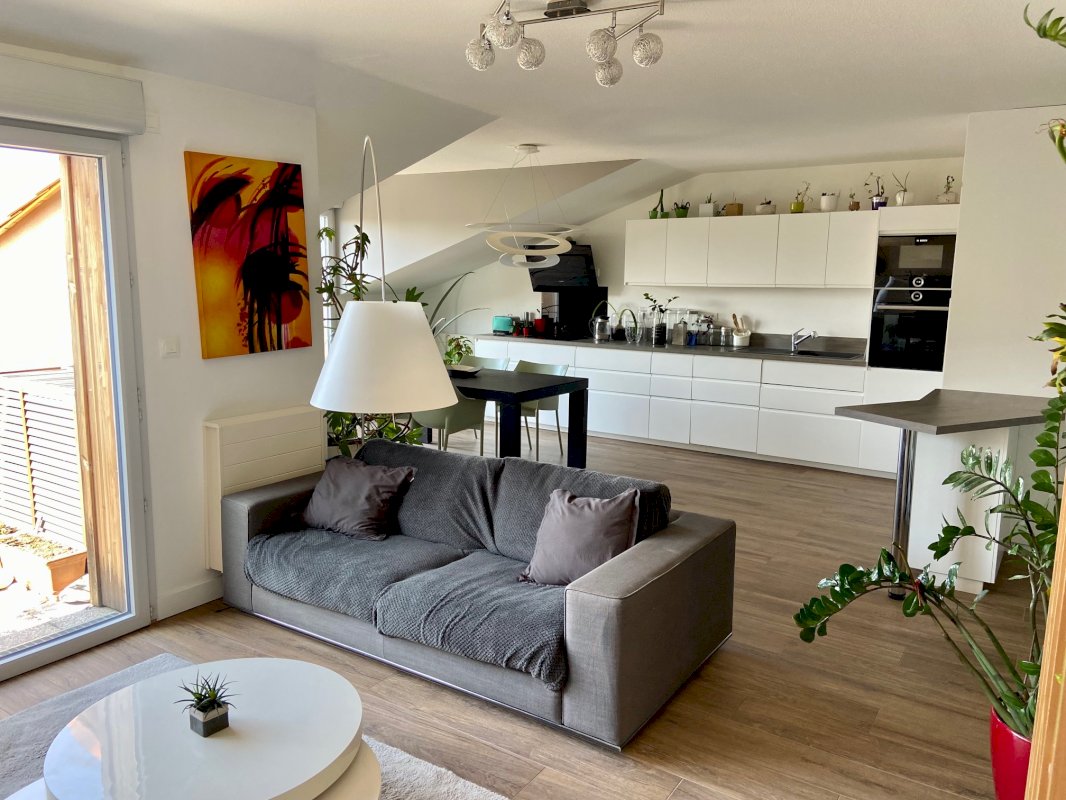 Ce superbe apt traversant, situé au 2e et dernier étage (avec ascenseur) se compose d’un vaste séjour-cuisine, baigné de lumière grâce à son exposition plein Sud, avec un accès direct sur une grande terrasse.