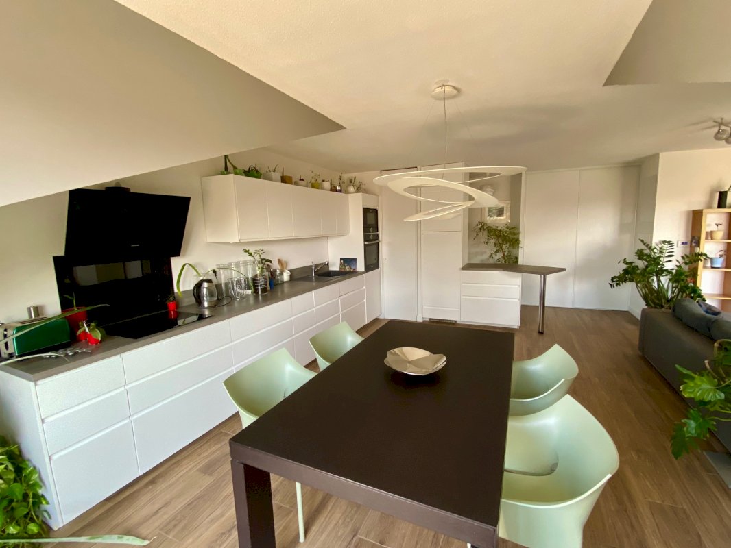 La cuisine équipée, ouverte, est idéale pour recevoir et profiter d’un espace convivial, et dispose également d’une sortie vers la 2e terrasse.