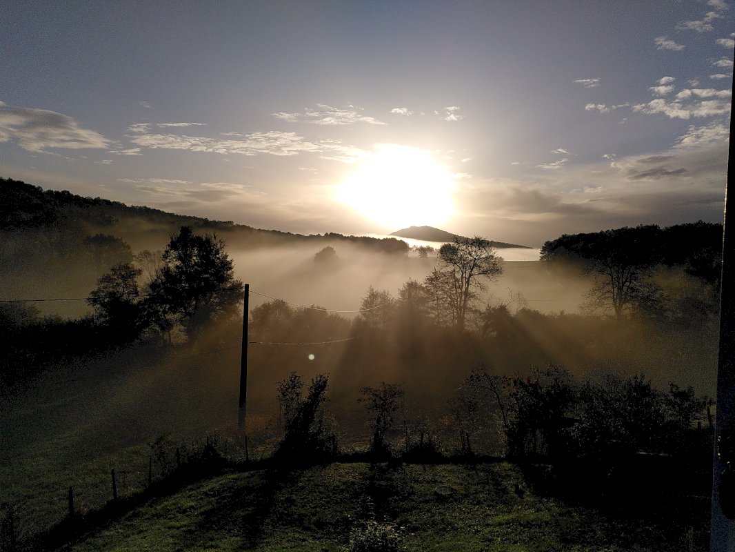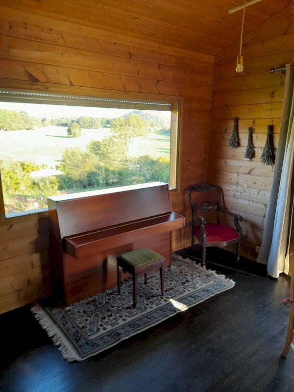L’orientation est – sud – ouest baigne la pièce de lumière et permet de se chauffer les beaux jours d’hiver, tandis que l’avancée de toit évite les surchauffes en été. La vue dégagée donne sur les prairies et les collines environnantes. Grâce aux murs faits de poutres de 13cm d’épaisseur, la maison offre une belle inertie et un confort thermique rare.