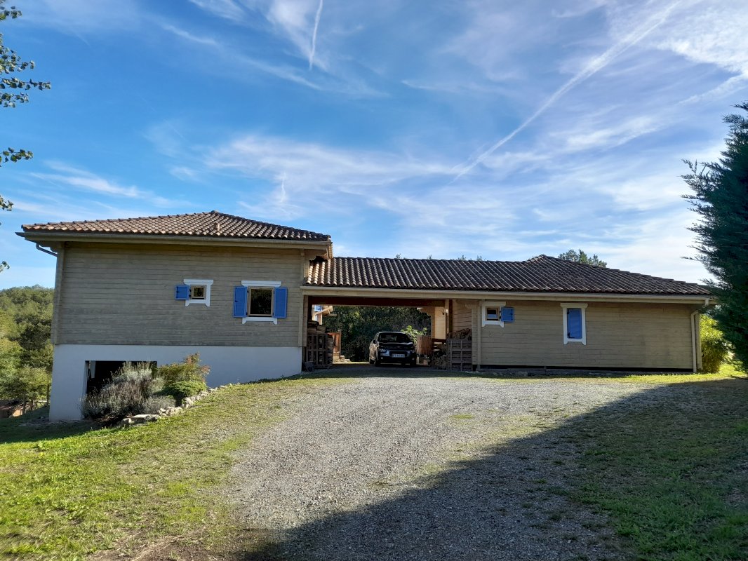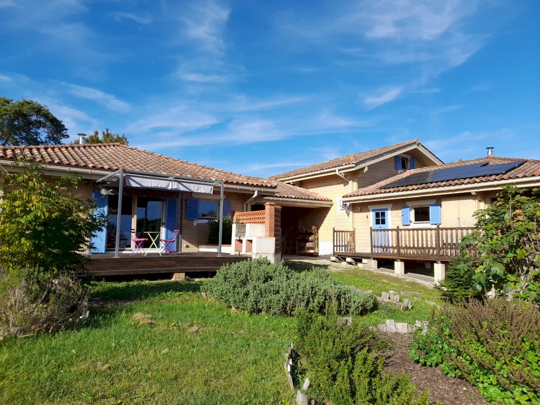 À vendre à Fabas, maison en madriers de 200m² et son gîte de 66m² sur un terrain de 2 500m² avec garage, parking, carport et jardin.