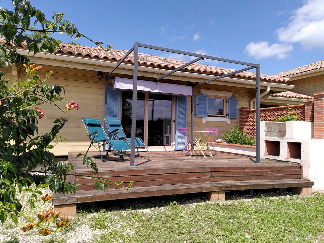 À vendre à Fabas, maison en madriers de 200m² et son gîte de 66m² sur un terrain de 2 500m² avec garage, parking, carport et jardin.