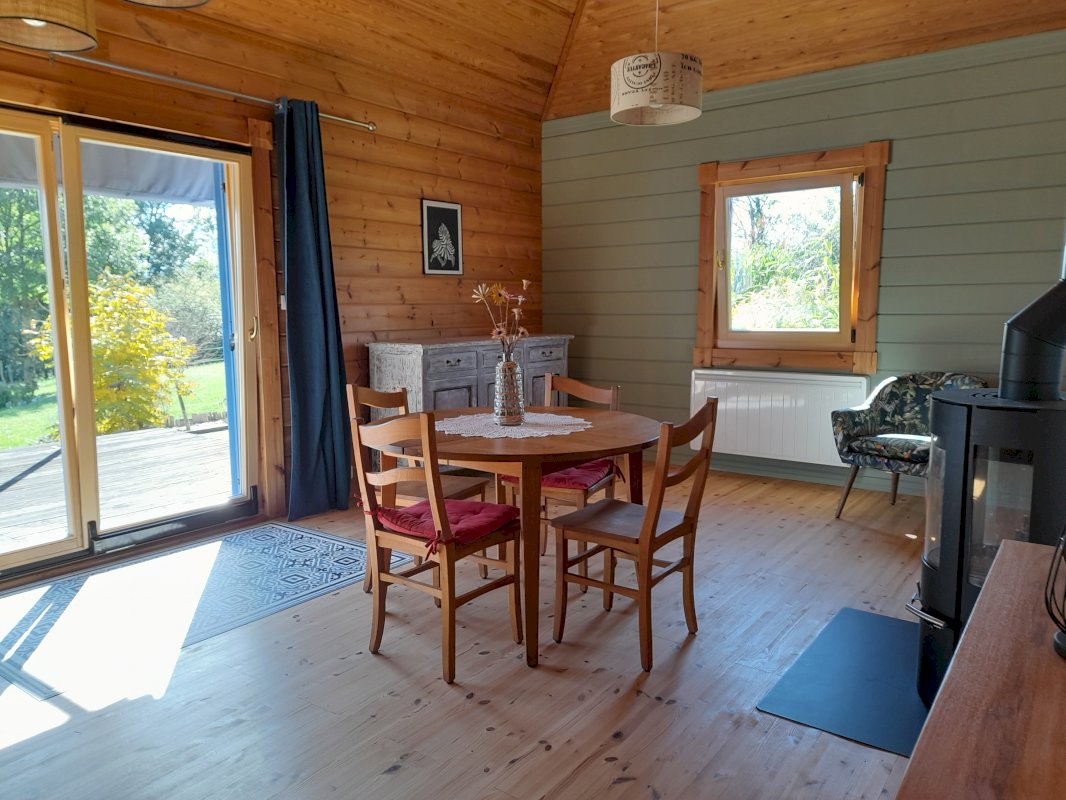 L’orientation est – sud – ouest baigne la pièce de lumière et permet de se chauffer les beaux jours d’hiver, tandis que l’avancée de toit évite les surchauffes en été. La vue dégagée donne sur les prairies et les collines environnantes. Grâce aux murs faits de poutres de 13cm d’épaisseur, la maison offre une belle inertie et un confort thermique rare.
