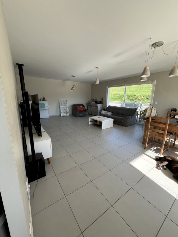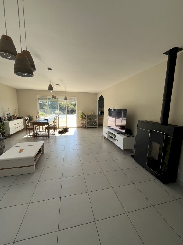 Cette maison de plain-pied comprend 5 pièces, dont 4 chambres et 2 salles de bains 3 wc. La cuisine est équipée et ouverte sur le séjour.