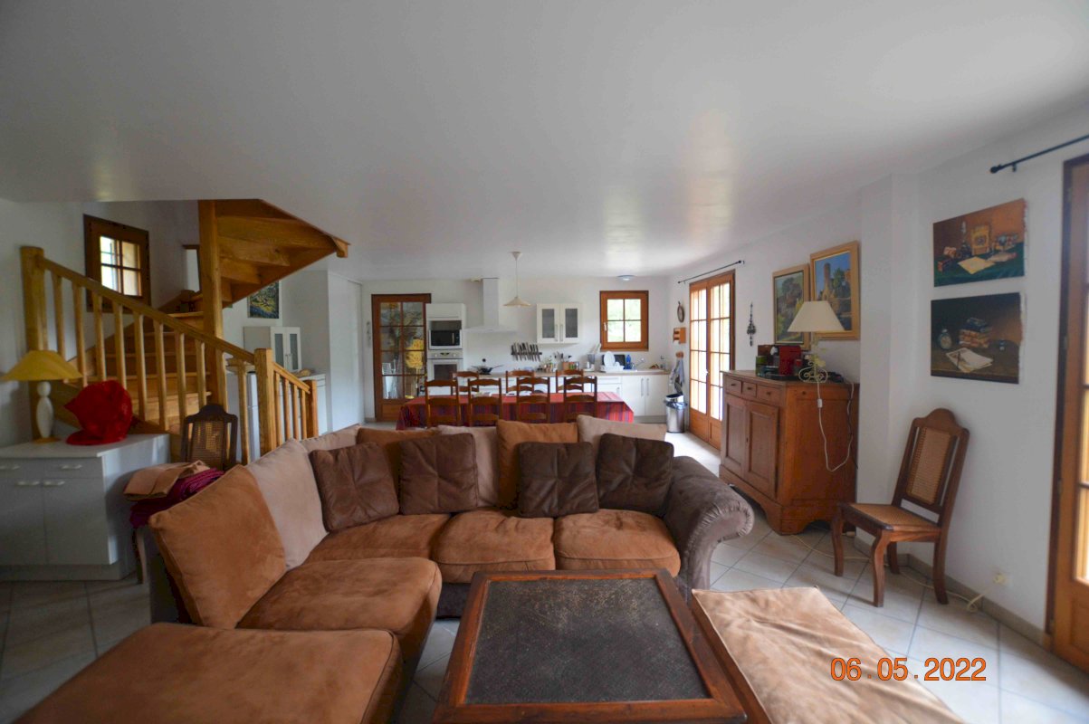 Au RDC : Séjour-cuisine américaine de 30m2 avec deux grandes baies donnant sur la vallée, ainsi que la Terrasse de 50m2. Garage communiquant avec le séjour, constituant une pièce à vivre supplémentaire de 24m2.