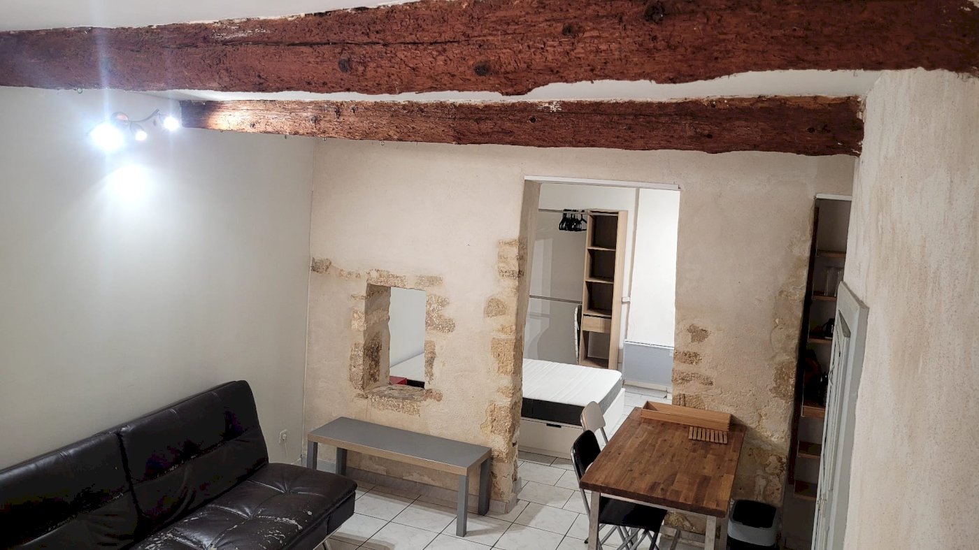 Au rez-de-chaussée d’un immeuble ancien de deux étages, ce F1 Bis de 29m2 a été entièrement rénové en 2017 avec pierres et poutres apparentes.