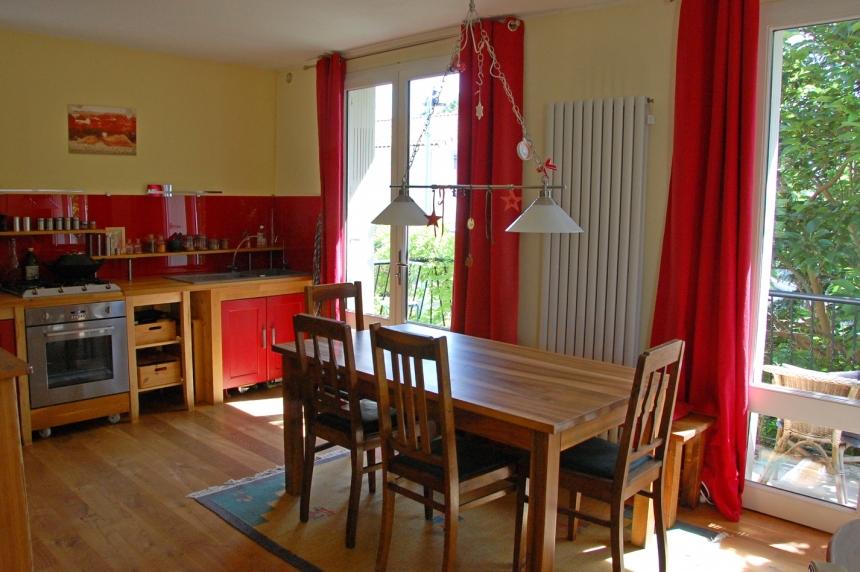 - Une salle à manger avec cuisine ouverte de 15 m², porte-fenêtre sur le jardin, plancher bois au sol.