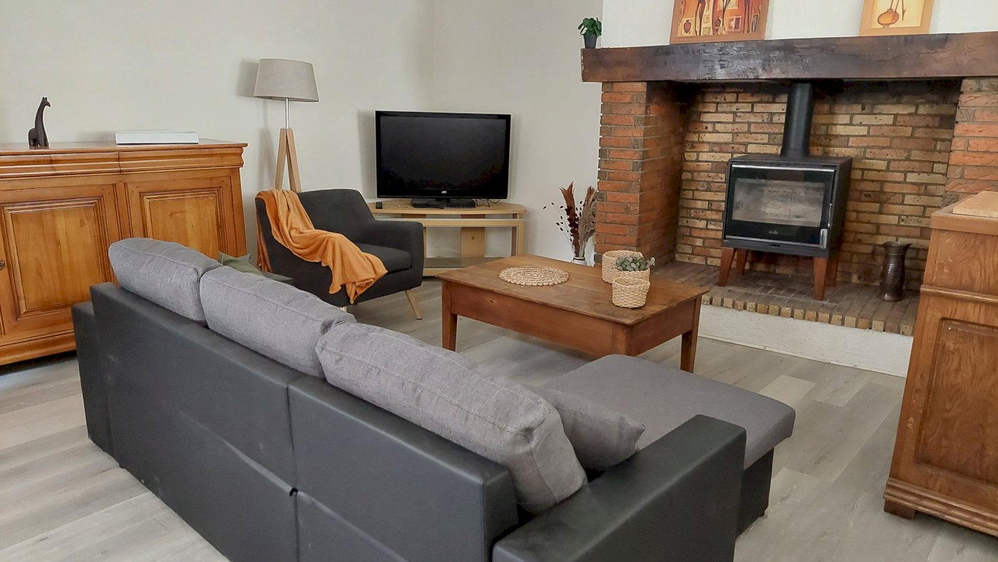 Grande cuisine aménagée en 2025 avec îlot. Séjour avec poêle à bois avec ouverture sur cuisine.
