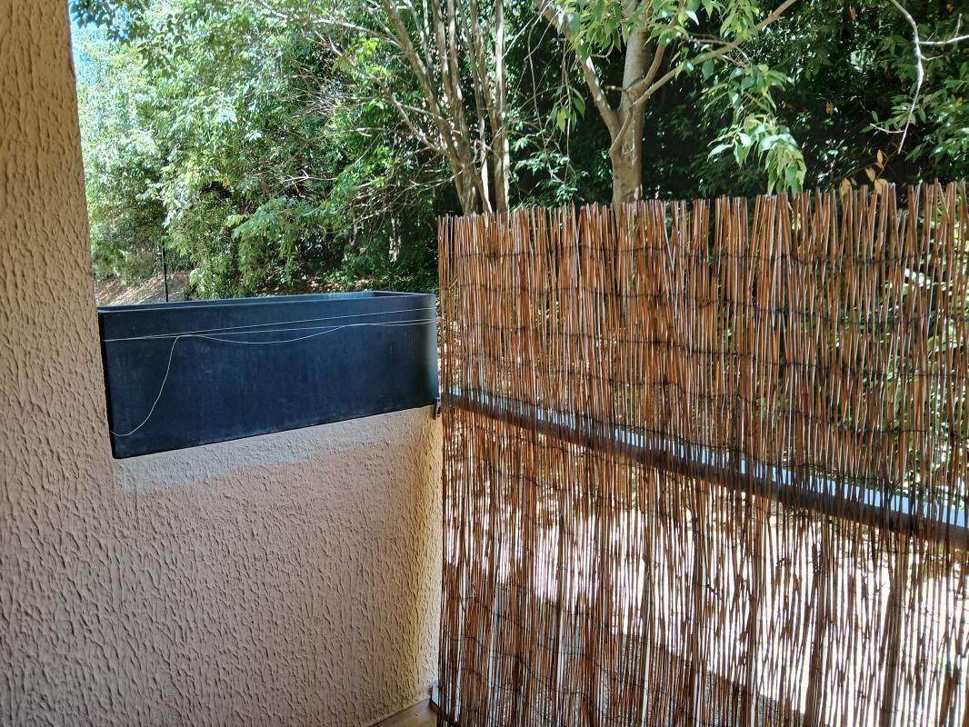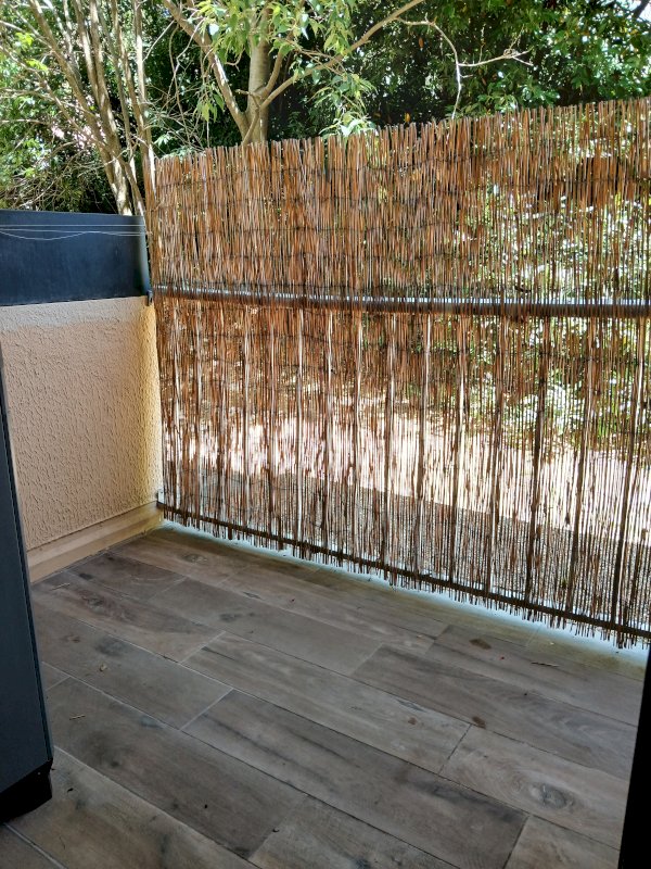 terrasse côté jardin, sans vis à vis, sécurisée avec grille de sécurité.