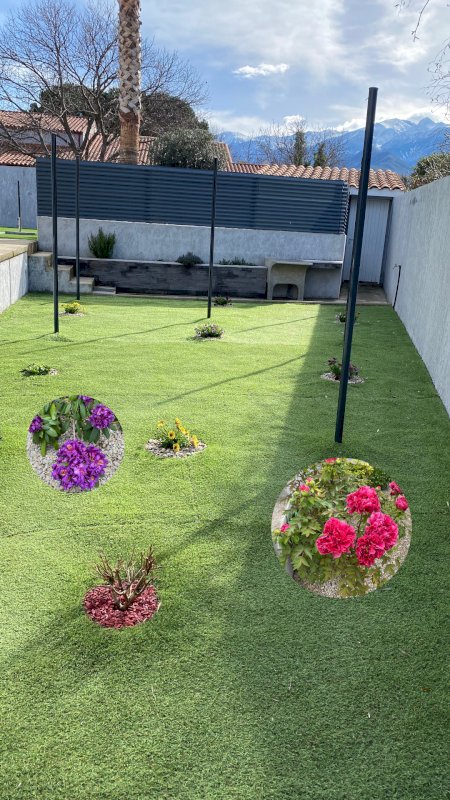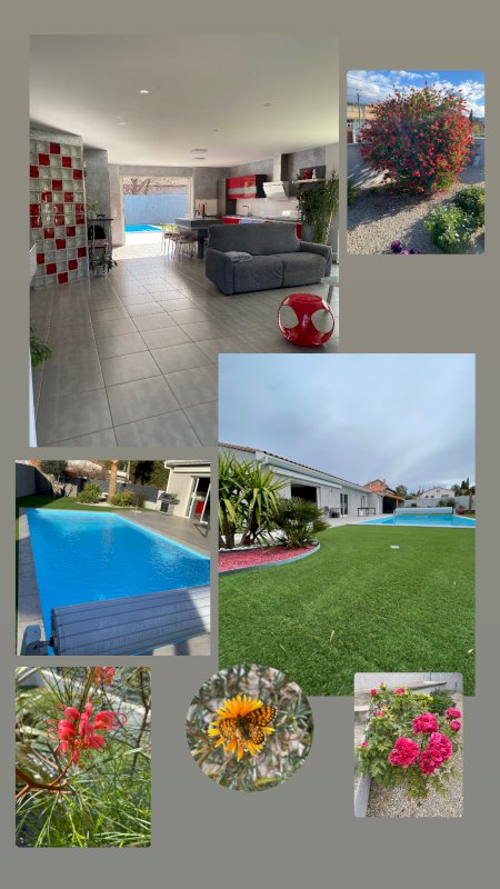 Villa hors lotissement trois faces de 115 m² en plain-pied et 657 m² de terrain plein sud sans mitoyenneté, arboré, gazon synthétique, terrasse carrelé de 72 m², piscine 4x8 au sel, chauffé, liner, 3 marches avec volets roulants électriques 2021. Un surpresseur pour relevage d'eau d'un puits dans un abri de 10 m².