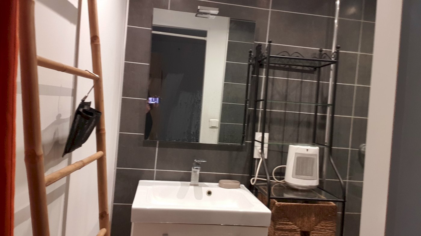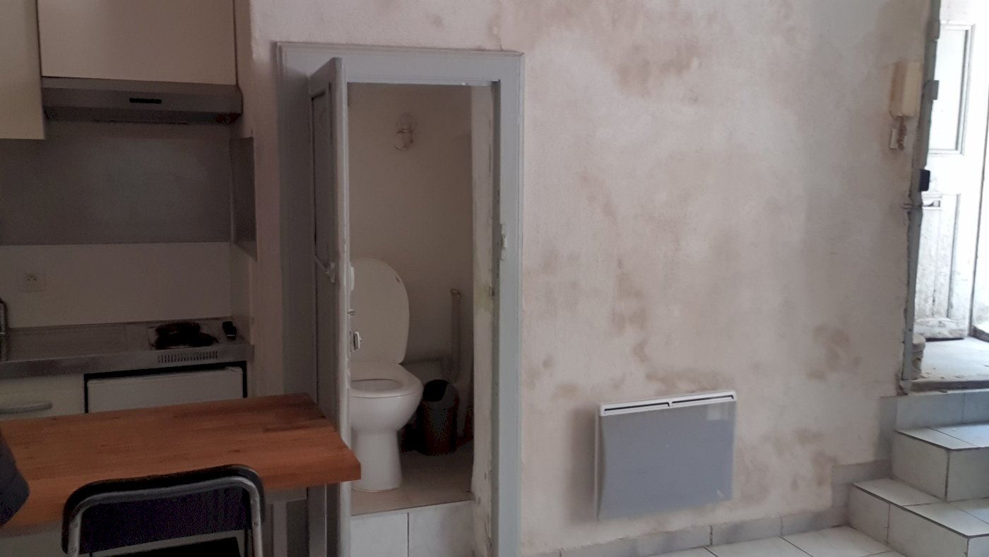 Au rez-de-chaussée d’un immeuble ancien de deux étages, ce F1 Bis de 29m2 a été entièrement rénové en 2017 avec pierres et poutres apparentes.