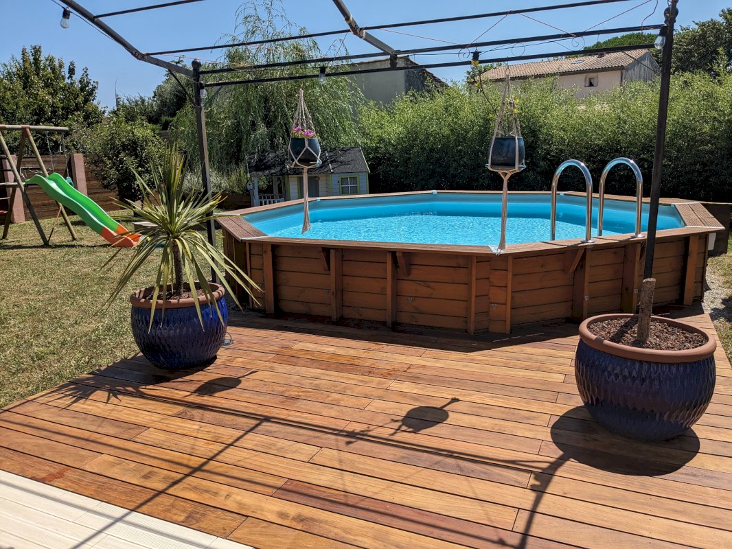 Profitez de l'extérieur avec le généreux terrain de 1000 m², aménagé d'une grande terrasse, d'une piscine hors sol hexagonale de 5*5m ainsi que d'un grand abri de jardin. Le portail d'entrée de la maison est motorisé.