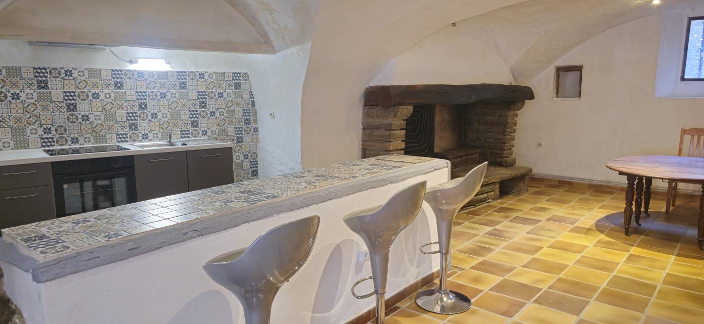 Au rez-de-chaussée : grande pièce à vivre avec cuisine équipée et cheminée en pierre (49m2).