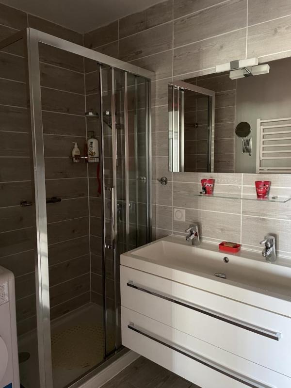 - Salle d'eau avec douche à l'italienne, porte coulissante, lavabo, double mitigeur, lave-linge, sèche serviettes.