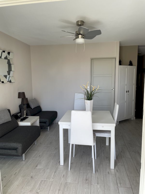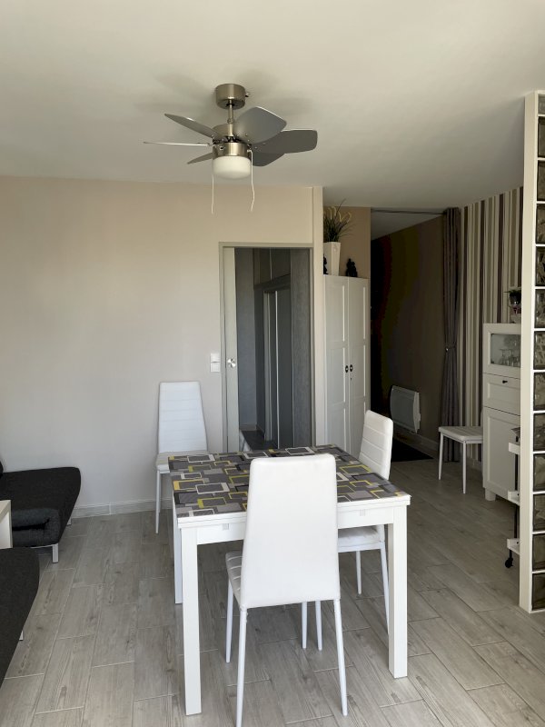 - Salon Séjour, ventilateur 5 pales, Table 2 allonges , 2 fauteuils, gris, chiné, transformables en couchage d'appoint, chauffage électrique