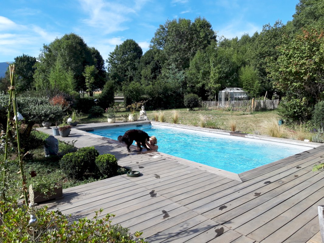 Maison de charme avec piscine dans un environnement calme et sans vis à vis, ambiance chaleureuse et vue sur les montagnes.