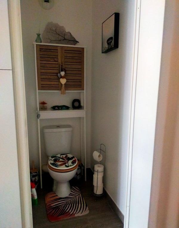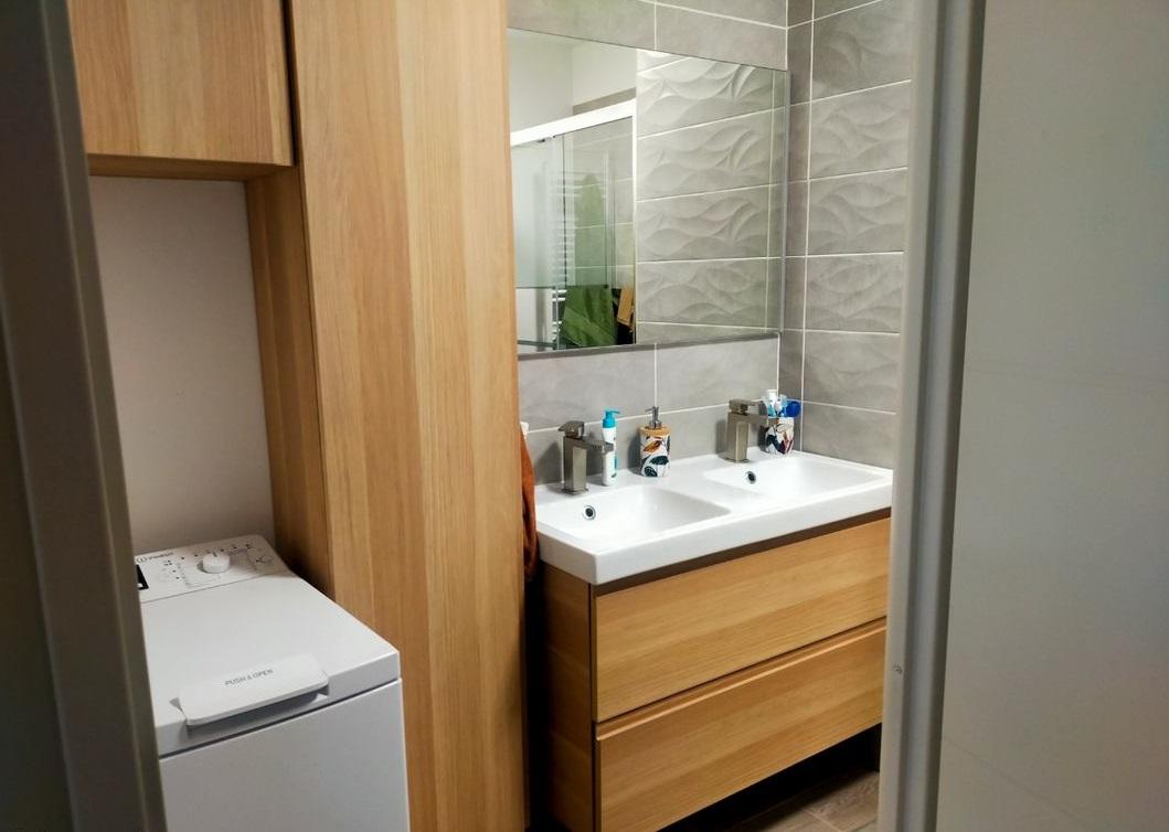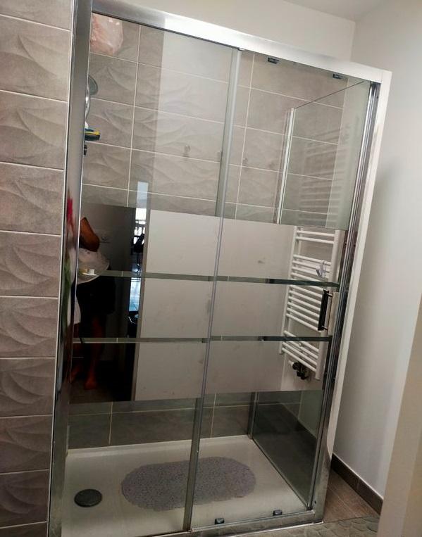 Salle de bain moderne avec placard de rangement, douche italienne avec parois fermées.