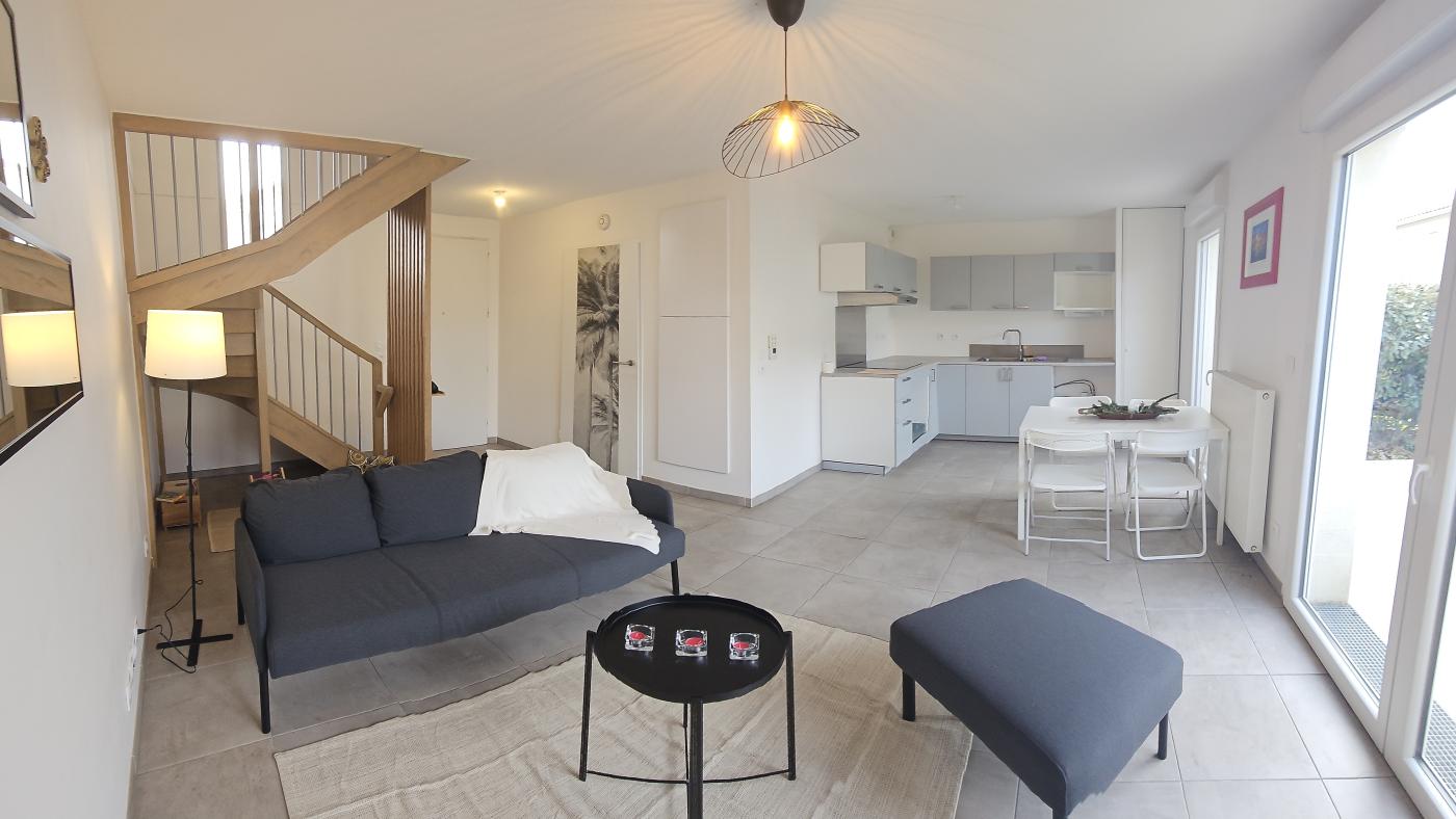 Composée d'une cuisine américaine, séjour lumineux, salle d'eau et d'un WC au RDC, de trois chambres, d'une salle de bains avec double vasque ainsi que d'un WC séparé, à l'étage.