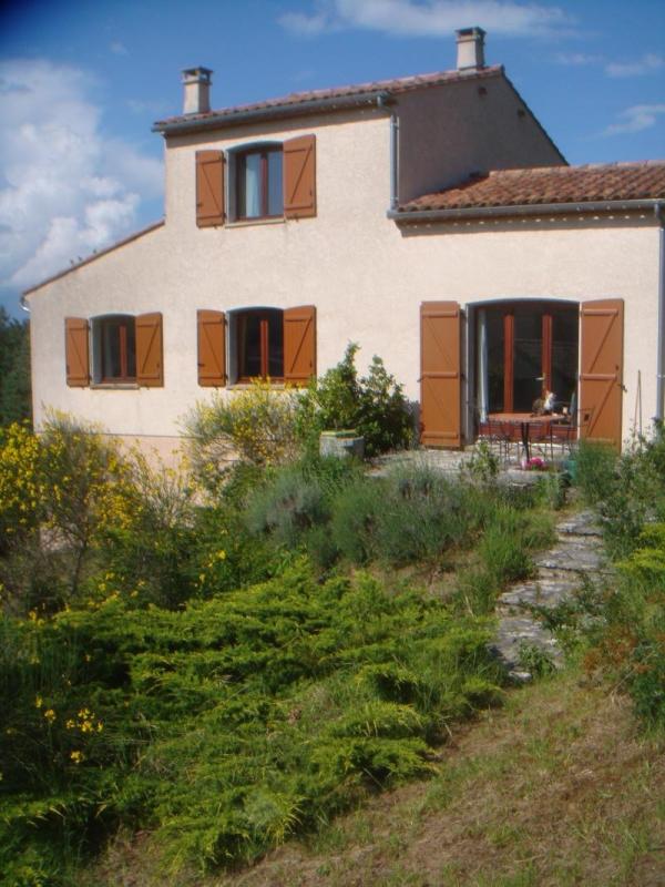 Elle est sur un terrain de 704m2, avec un jardin facile à entretenir (très peu de besoins en eau), un petit balcon et une terrasse avec une vue remarquable sur les montagnes et collines alentours.