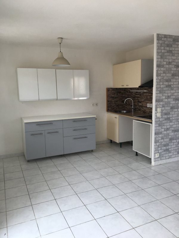 Un grande pièce à vivre très lumineuse de 31.58 m², avec coin cuisine comportant un évier inox, une plaque de cuisson vitrocéramique, une hotte, des meubles de rangement hauts, et un meuble bas Ikea.