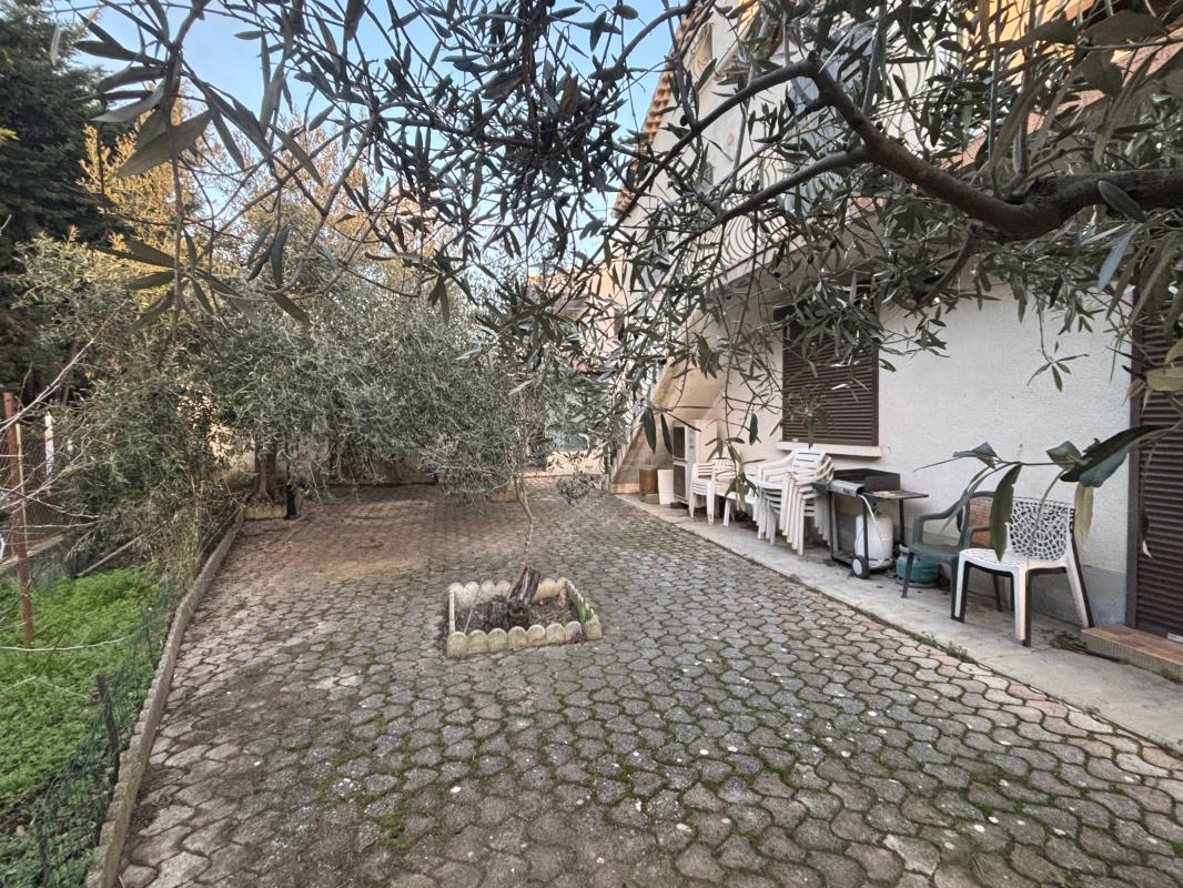 Le terrain clos et arboré de 590 m² dispose d'une terrasse ensoleillée et d'un espace ombragé, parfait pour les dîners d'été en plein air. Un barbecue en dur invite à la convivialité.