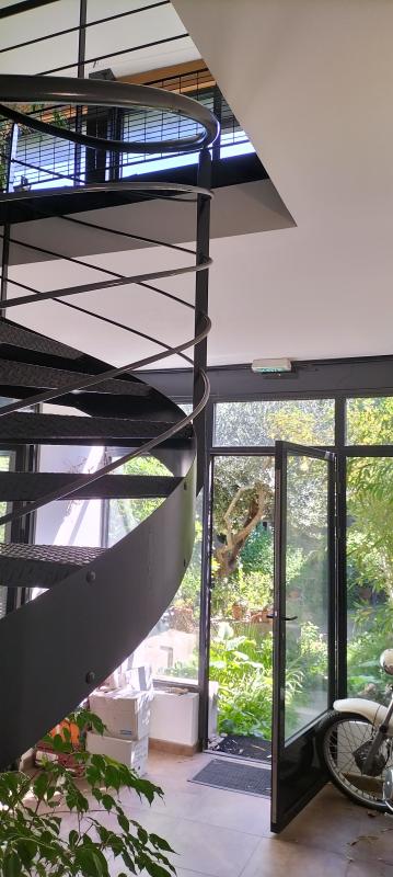 Dans un second corps de bâtiment, un espace bureau de 100 m2 à l’étage de l’ancien chaix est aménagé en plateau libre, avec parquet, poutres apparentes et façade rideau en acier/ verre double vitrage, ouverte sur le jardin pour la partie atelier de 60 m2 en RDC, l’ensemble est climatisé avec entrées indépendantes et comprend un wc/lave-mains, un atelier avec plans de travail et point d’eau, électricité/téléphone indépendants local professionnel.