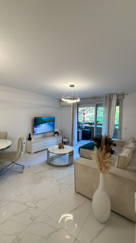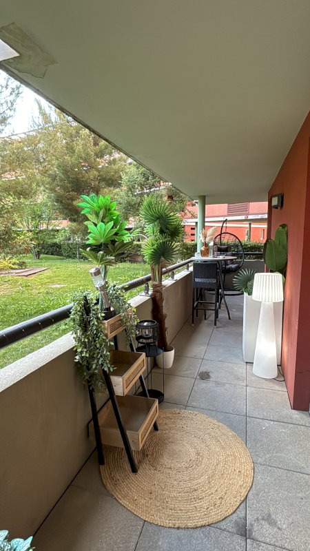 Au rez de chaussée surélevé, superbe appartement F3 comprenant: cuisine ouverte sur séjour, 2 chambres spacieuses, salle de bains wc. Salle à manger et chambres avec porte fenêtre donnant sur un balcon terrasse 14m2 avec vue sur jardin privé. Climatisation réversible
