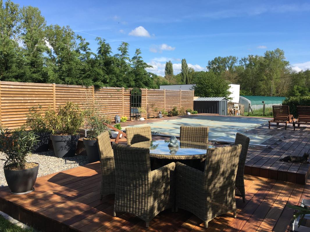 Il ne faut pas oublier, la piscine au sel (4m sur 8m) chauffée par pompe à chaleur, avec sa plage en bois exotique (cumaru) et le tilleul à l'ombre duquel il fait bon se reposer.