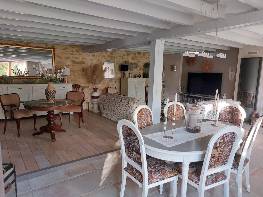 L'entrée de la première partie s'ouvre sur un hall d'entrée qui dessert un grand séjour style bohème de 50 m2 avec poêle à bois, la chaufferie et le WC . Une cuisine de 16m2, entièrement équipée vient à la suite, elle-même prolongée par une buanderie de 9 m2.