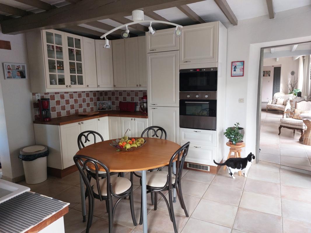 La seconde partie (la partie gîte) a sa propre entrée, dont le hall dessert un wc et le séjour avec cuisine ouverte (40m2), cette pièce est équipée d'un poêle à pellets,