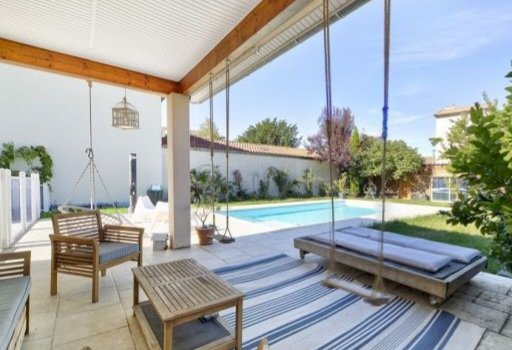 A l extérieur une grande terrasse donnant sur un jardin cloturé avec piscine chauffée et annexe (pool house)
