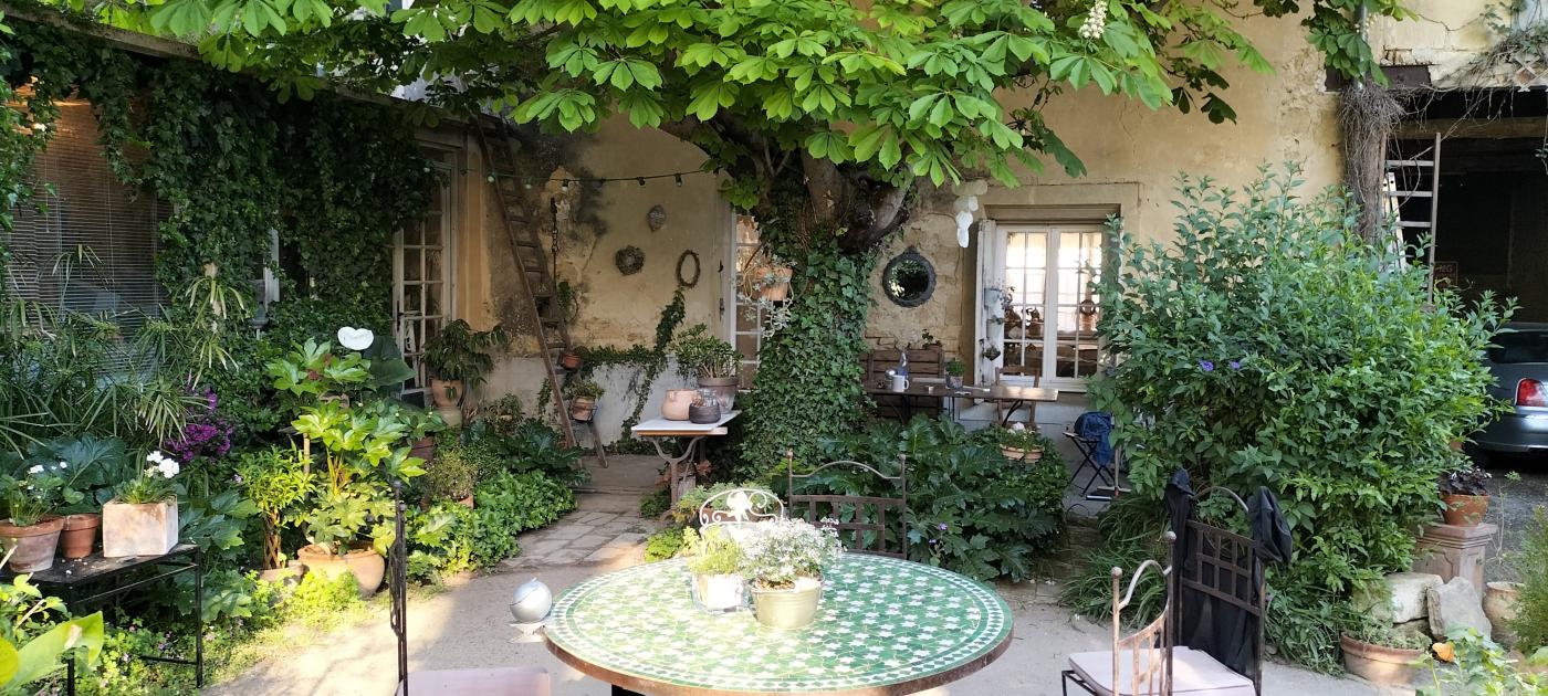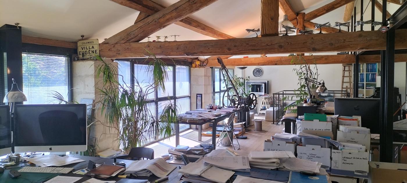 Dans un second corps de bâtiment, un espace bureau de 100 m2 à l’étage de l’ancien chaix est aménagé en plateau libre, avec parquet, poutres apparentes et façade rideau en acier/ verre double vitrage, ouverte sur le jardin pour la partie atelier de 60 m2 en RDC, l’ensemble est climatisé avec entrées indépendantes et comprend un wc/lave-mains, un atelier avec plans de travail et point d’eau, électricité/téléphone indépendants local professionnel.