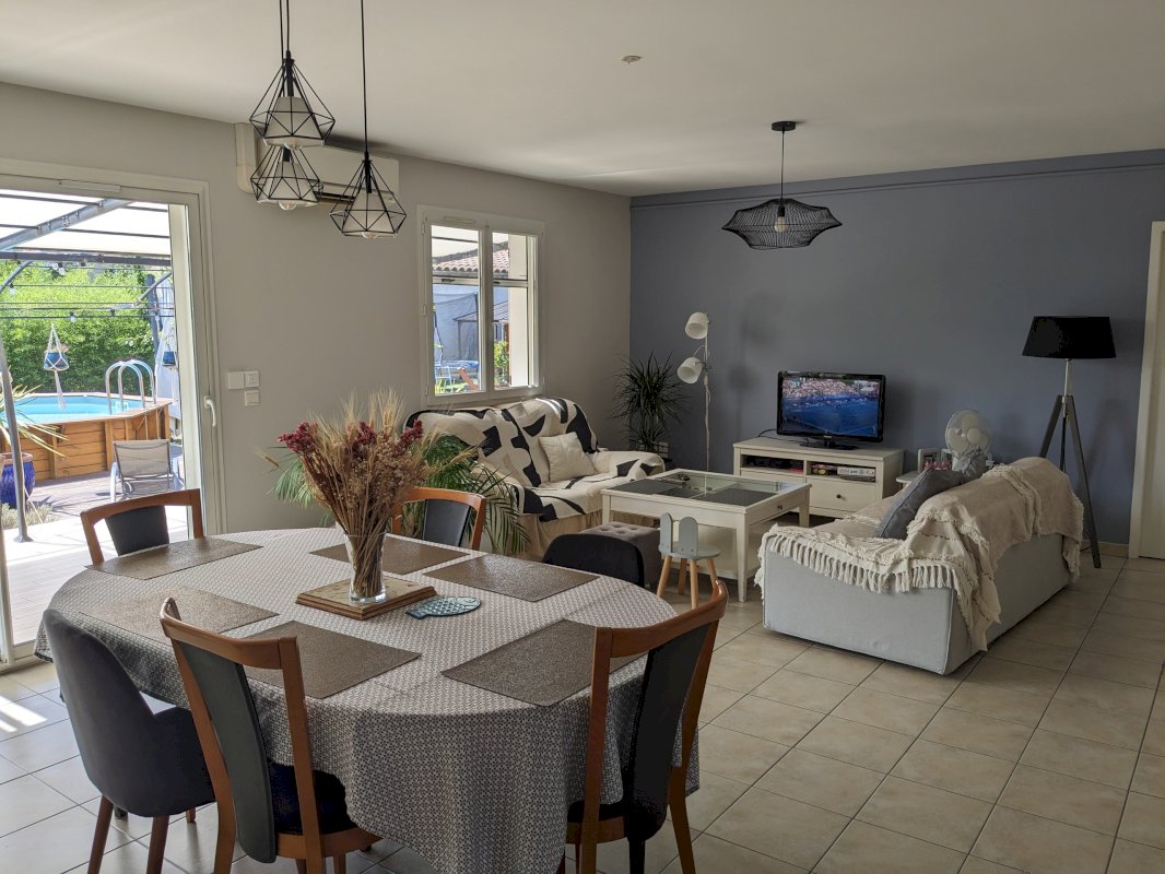 La pièce de vie de 45 m² est le cœur de la maison, créant un espace convivial et lumineux.